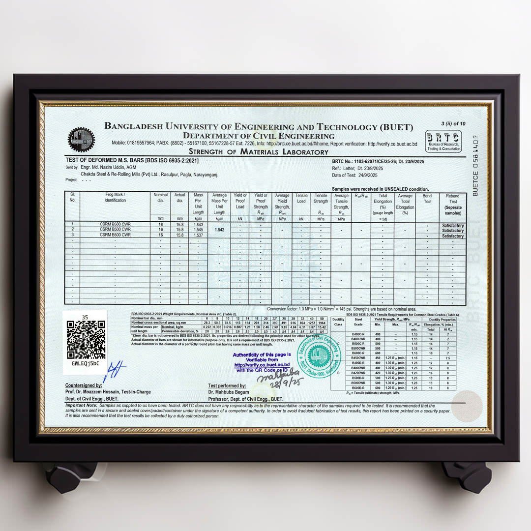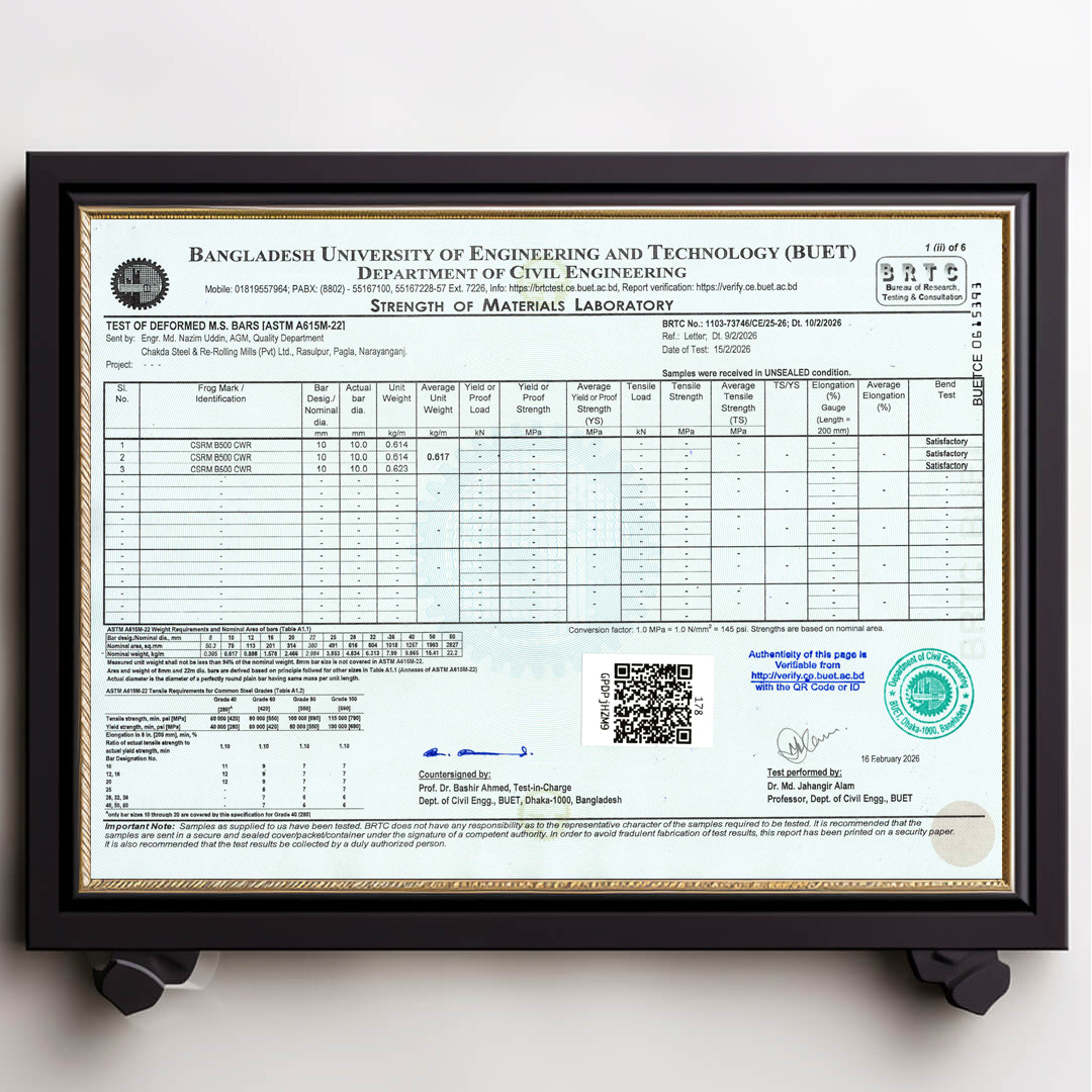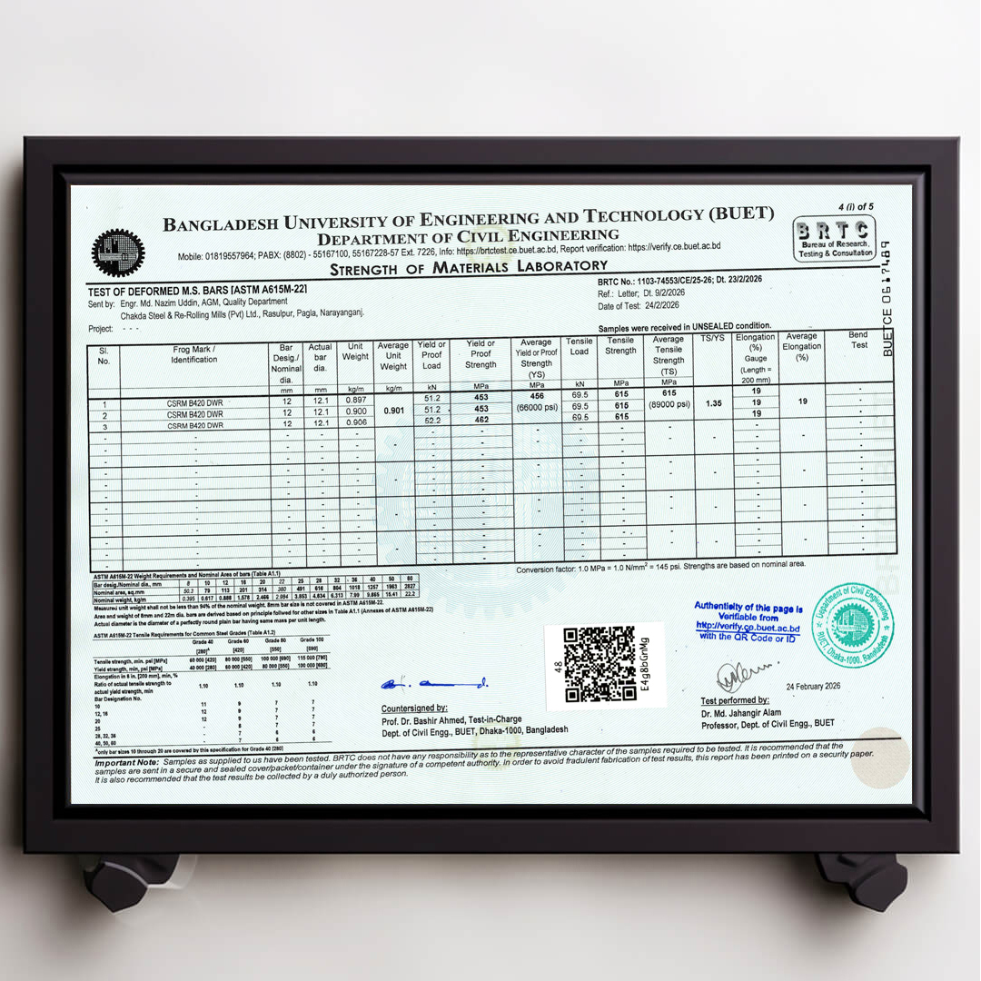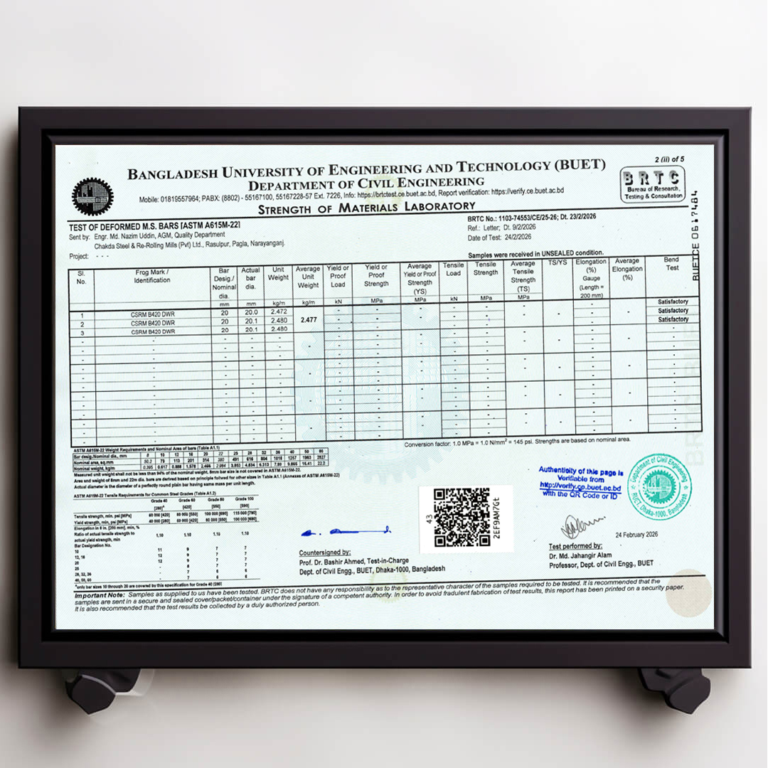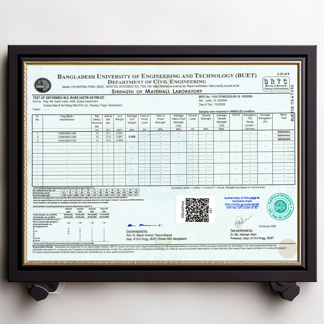 We always ensure that our products are up to date with authentic BUET Test Reports. Remember that CSRM is the best rod in Bangladesh that always has updated BUET certifications.
