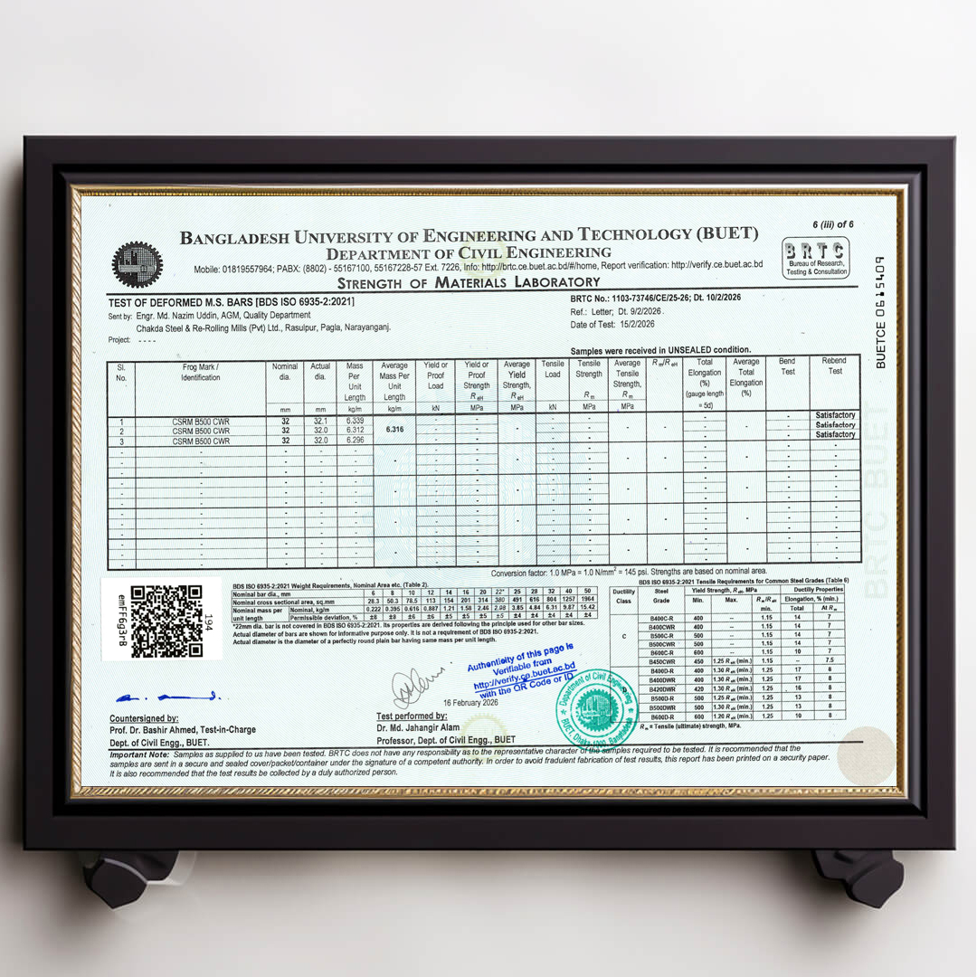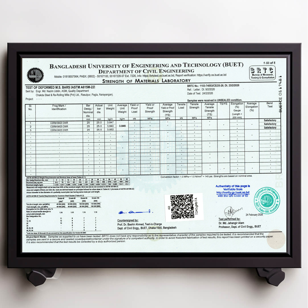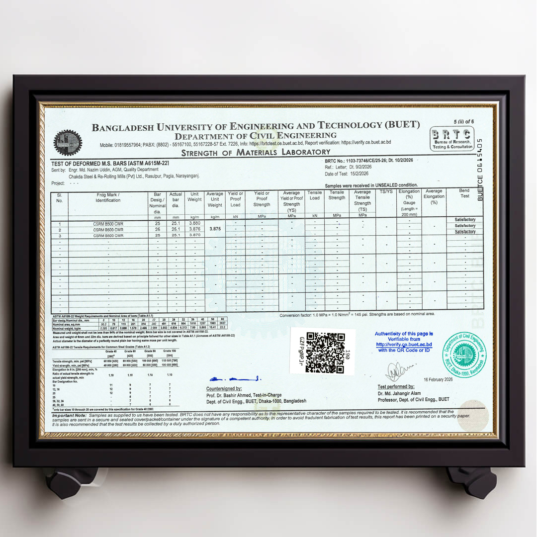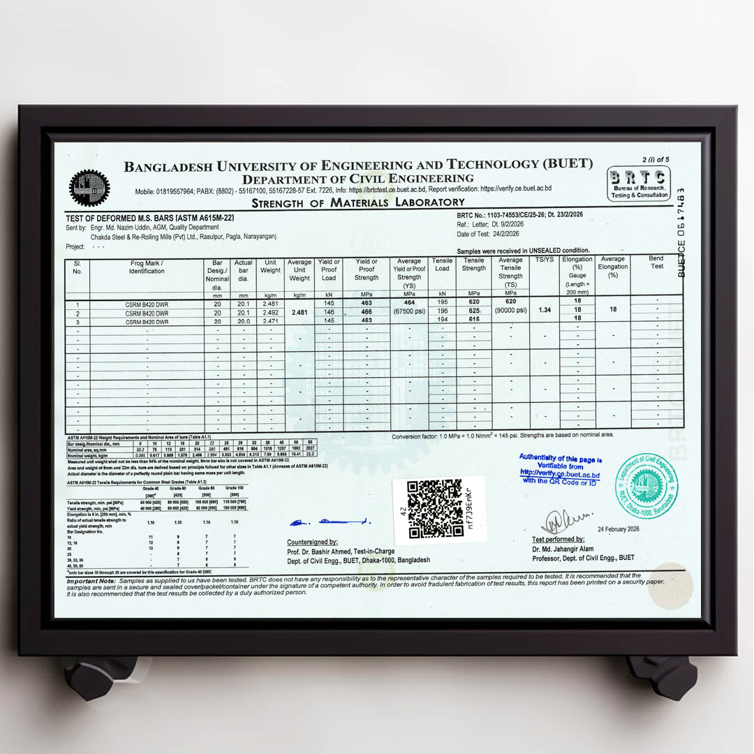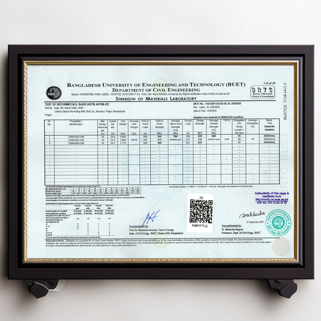 We always ensure that our products are up to date with authentic BUET Test Reports. Remember that CSRM is the best rod in Bangladesh that always has updated BUET certifications.