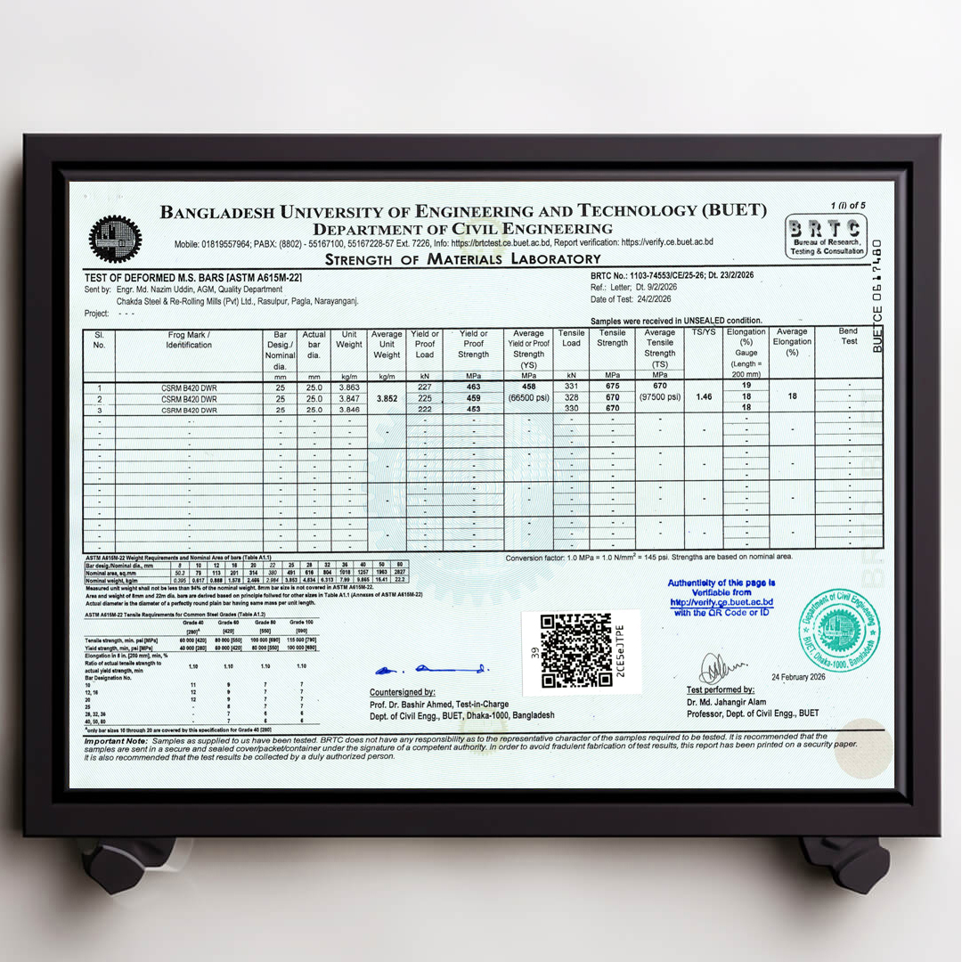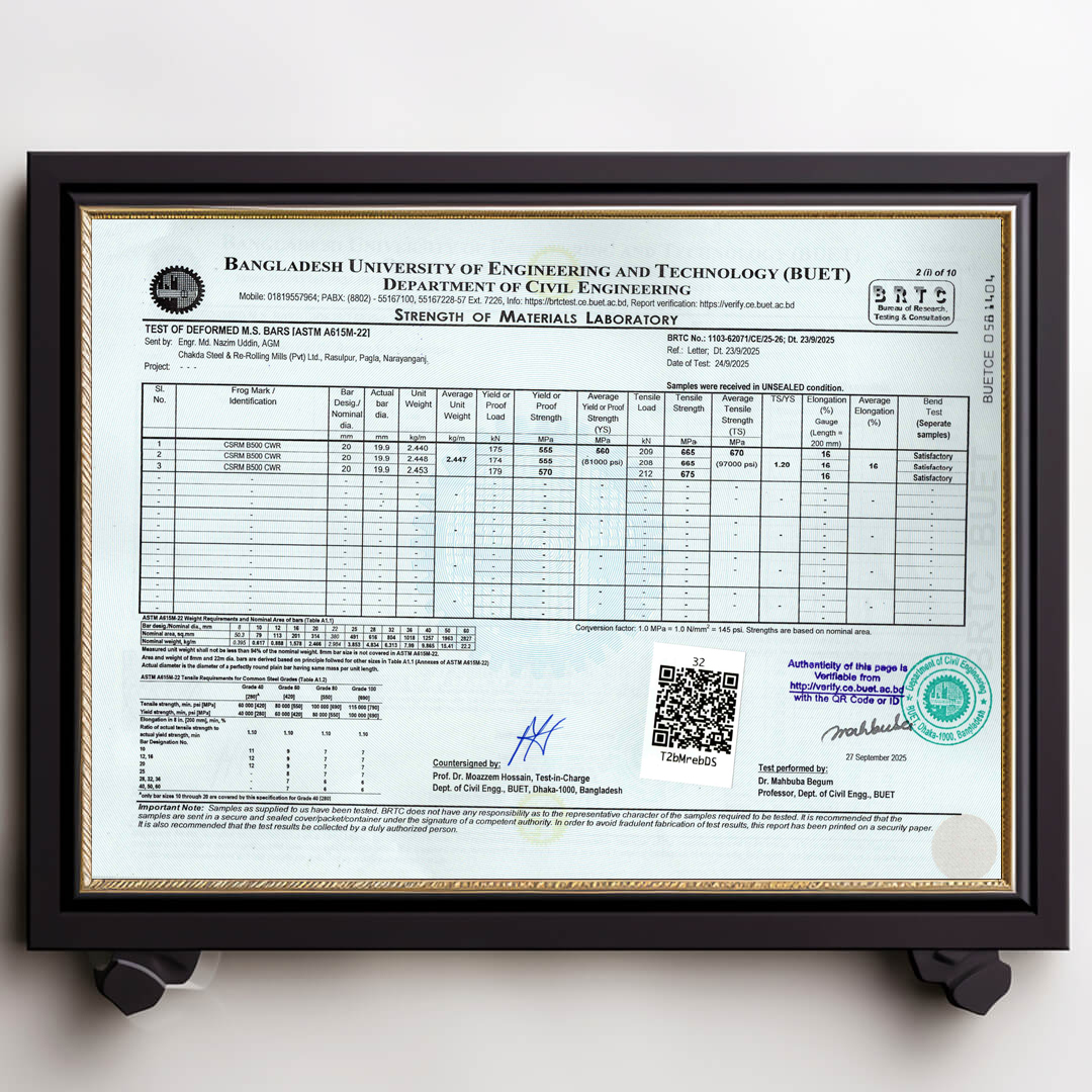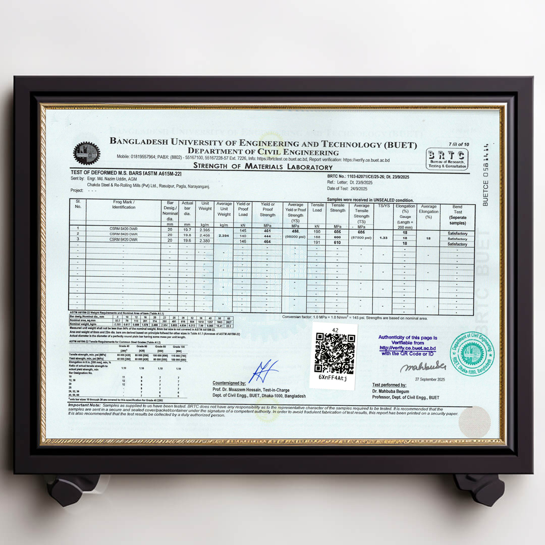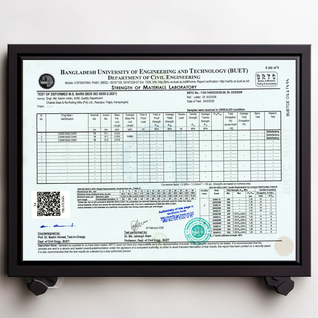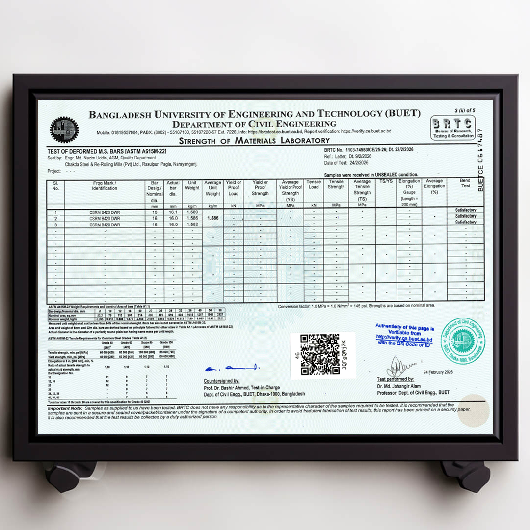 We always ensure that our products are up to date with authentic BUET Test Reports. Remember that CSRM is the best rod in Bangladesh that always has updated BUET certifications.
