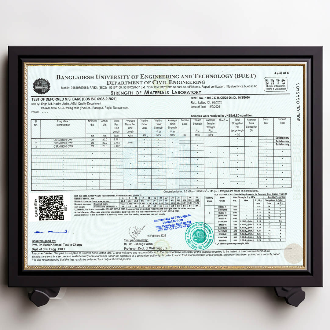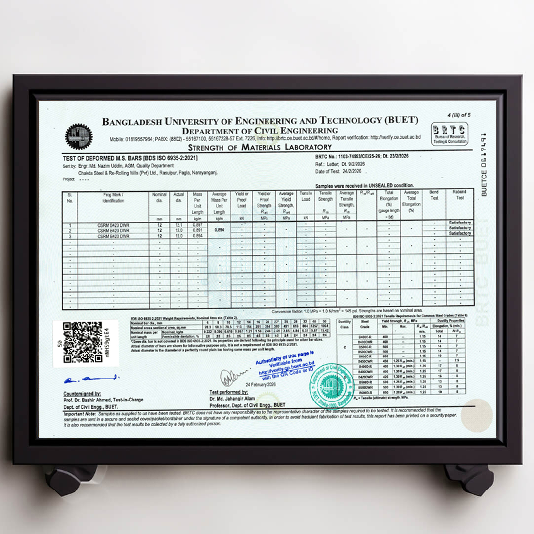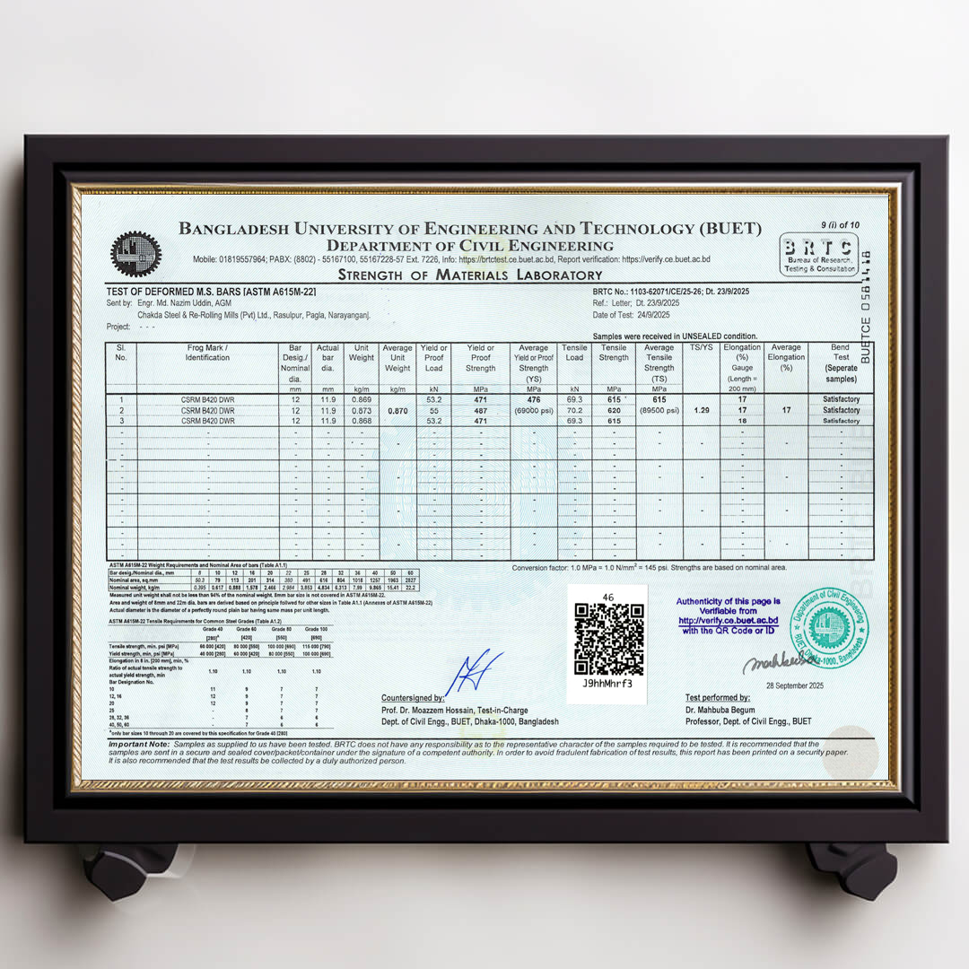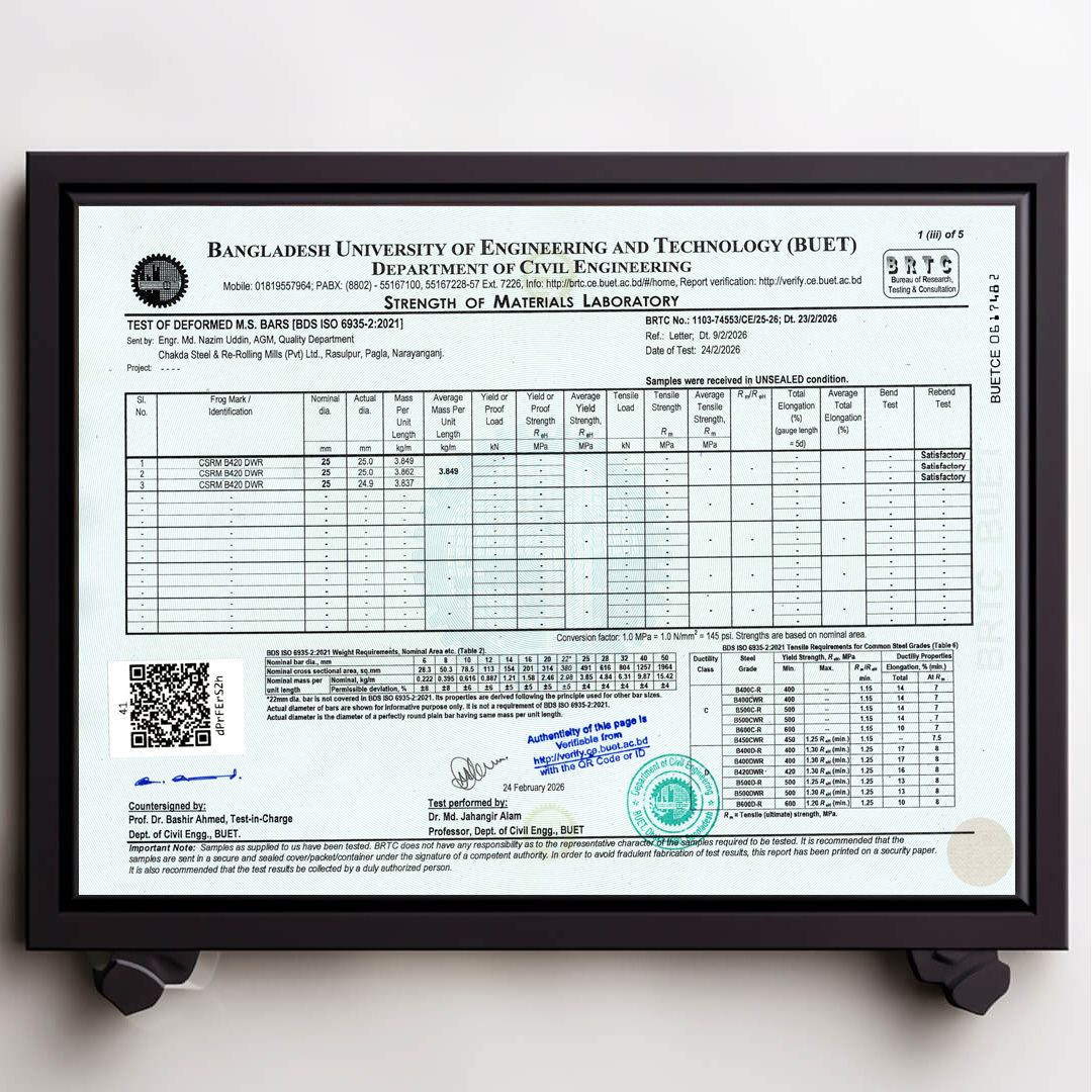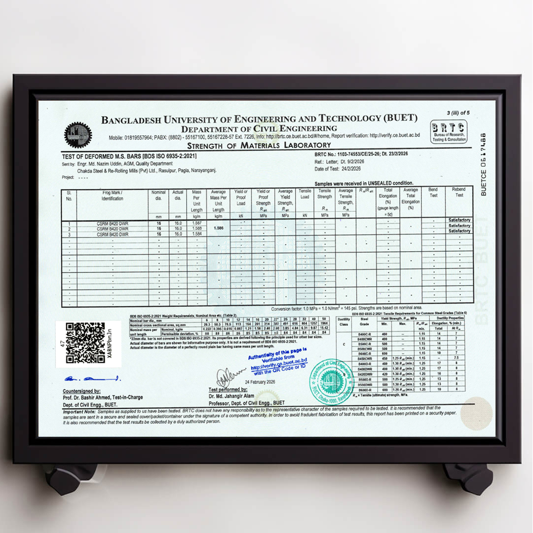 We always ensure that our products are up to date with authentic BUET Test Reports. Remember that CSRM is the best rod in Bangladesh that always has updated BUET certifications.